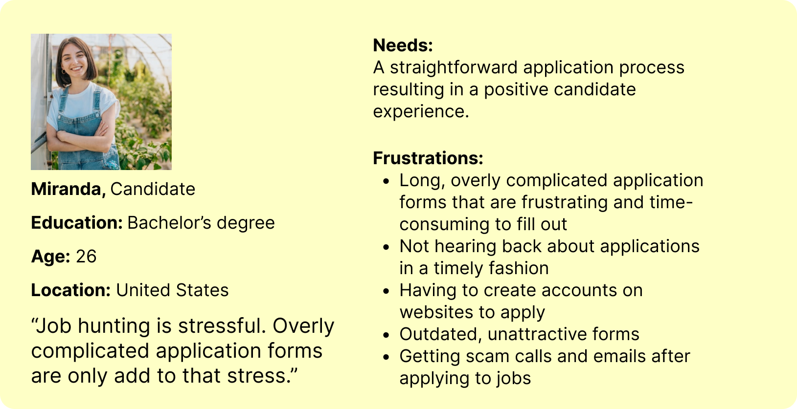 The primary user for the flow we’re redesigning is a candidate. Other possible users include hiring managers, recruiters, and administrative users. There may be other candidate personas, including those with varying levels of education and different professional backgrounds.